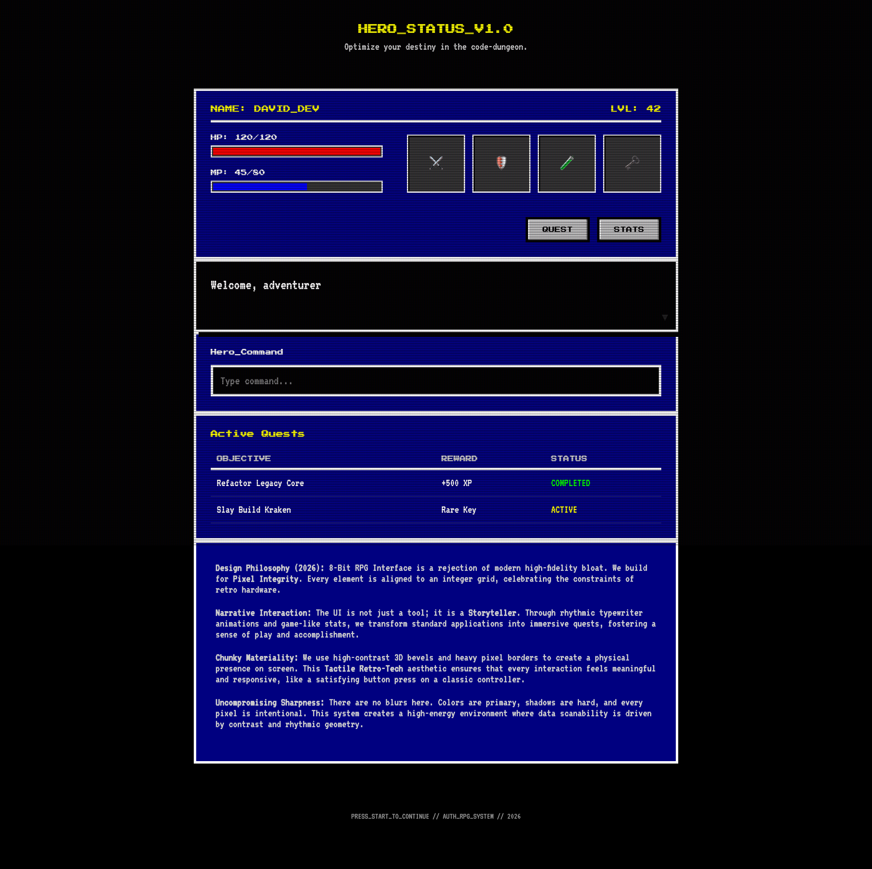 A nostalgic, pixel-perfect aesthetic that mimics classic role-playing game interfaces, featuring chunky pixel borders, typing-dialog animations, and high-contrast primary palettes.