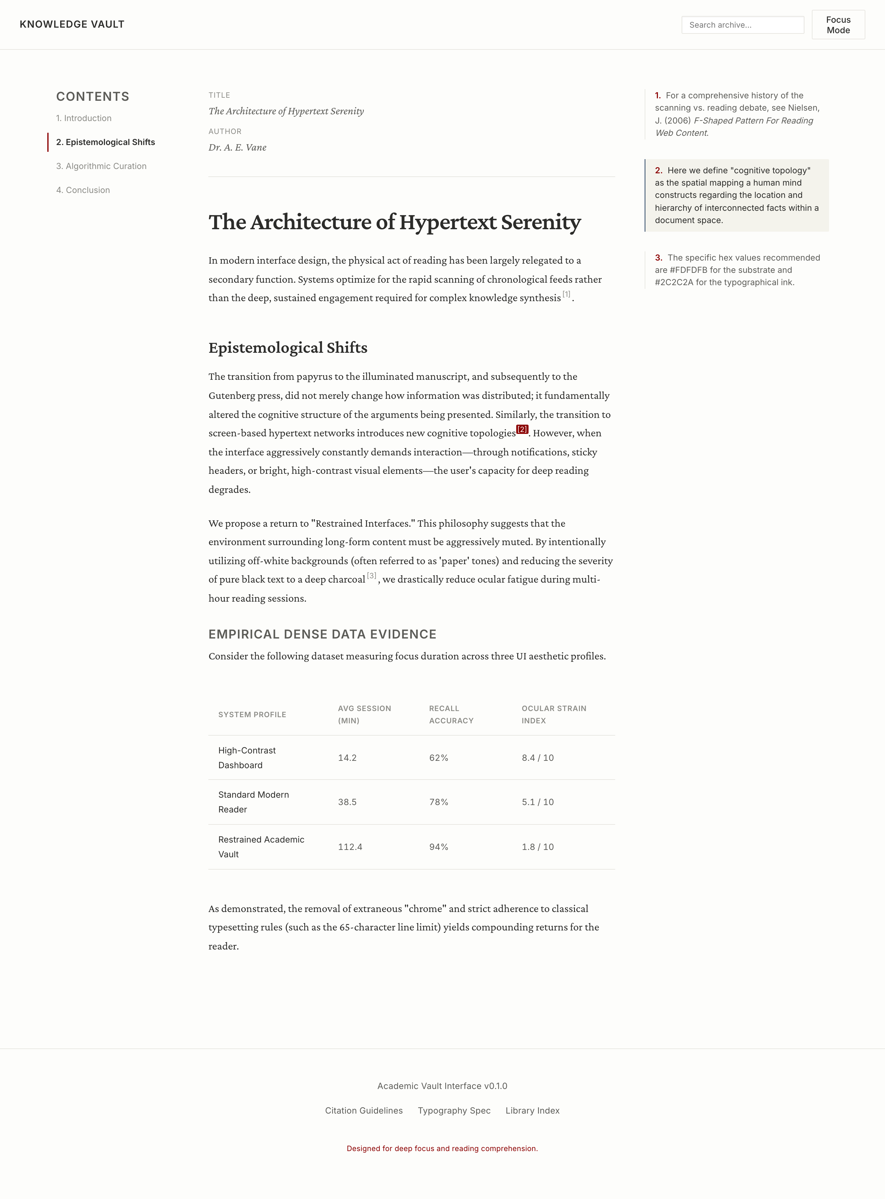 A highly restrained, typography-first environment optimized for long-form reading, dense citation networks, and focused knowledge synthesis.