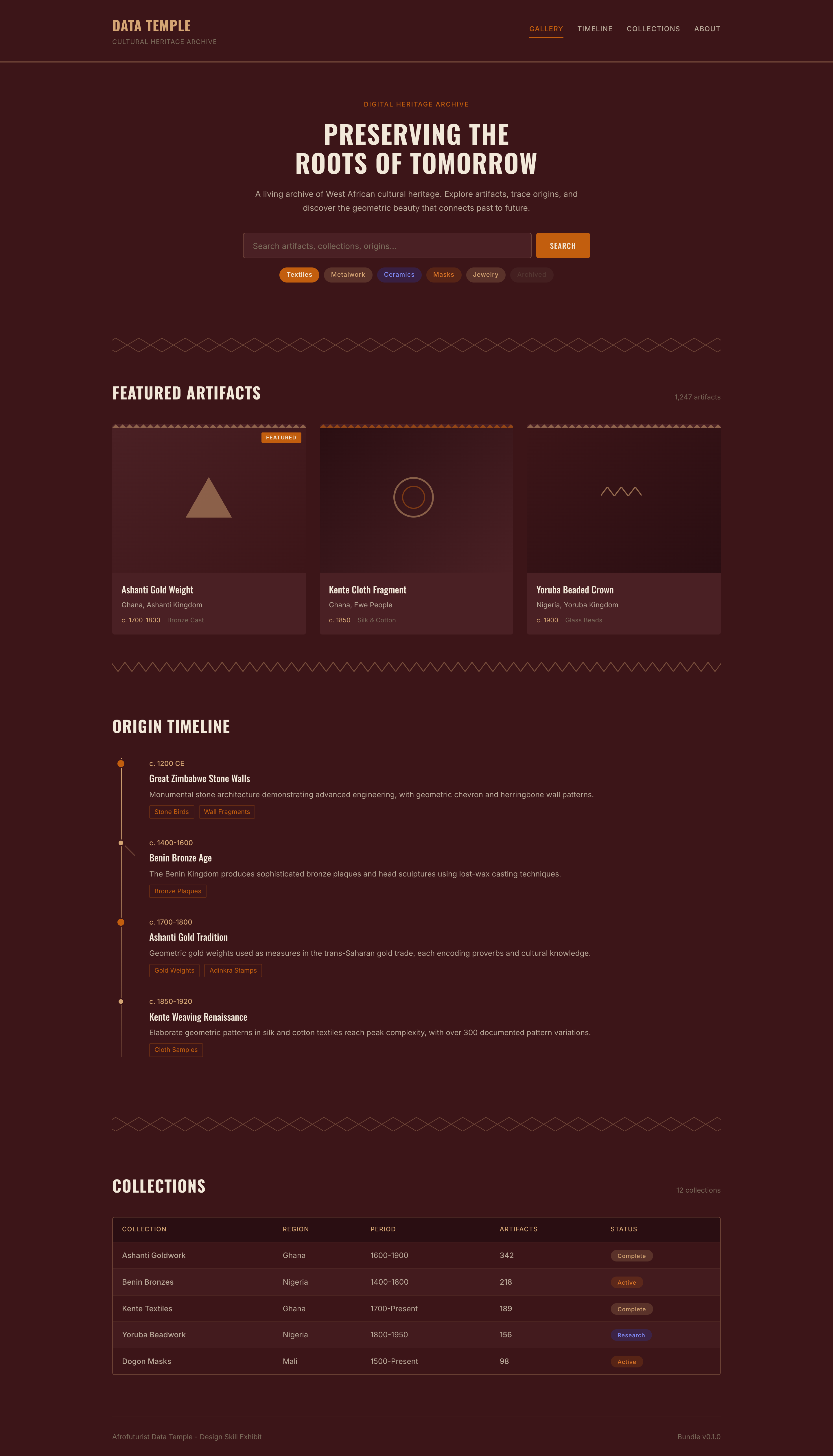 This Design Skill provides a bold, culturally grounded design language for digital heritage archives. It fuses West African geometric patterns (triangles, zigzags, concentric circles) with rich earth-and-gold palettes on deep brown (`#3C1518`) foundations. Artifact galleries use geometric-framed cards, timelines flow as river-like paths with branching gold nodes, and Oswald headlines at bold weight create commanding visual hierarchy. The system treats data presentation as cultural expression.