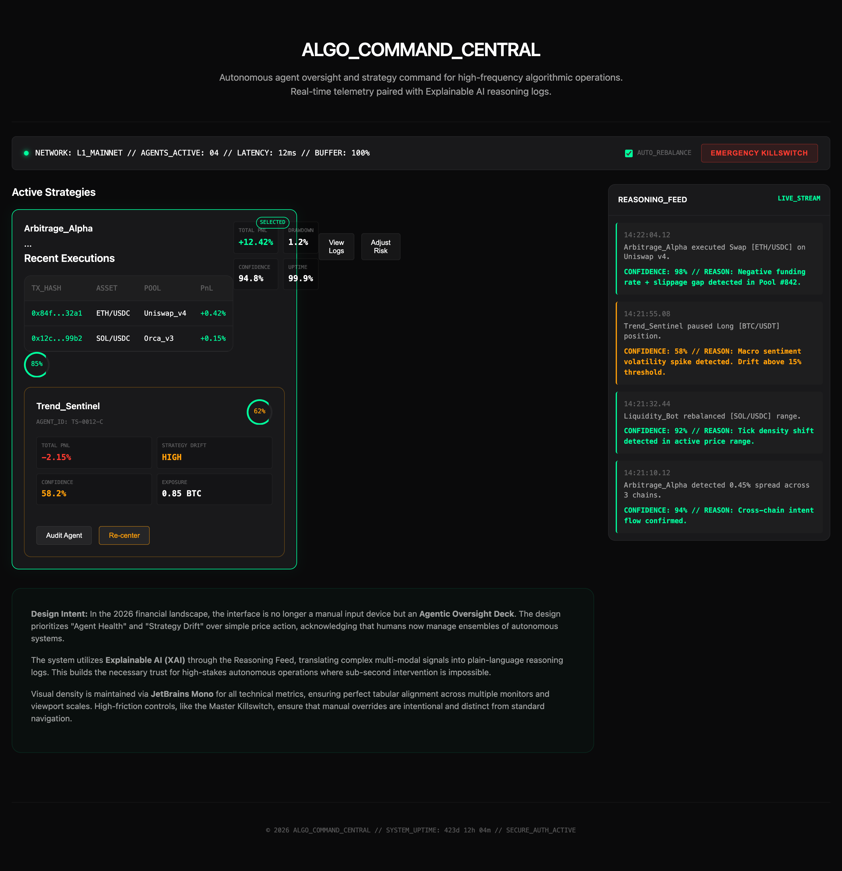 A high-density "Agent-First" command center designed for overseeing autonomous trading strategies through real-time telemetry, risk heatmaps, and explainable AI (XAI) reasoning logs.