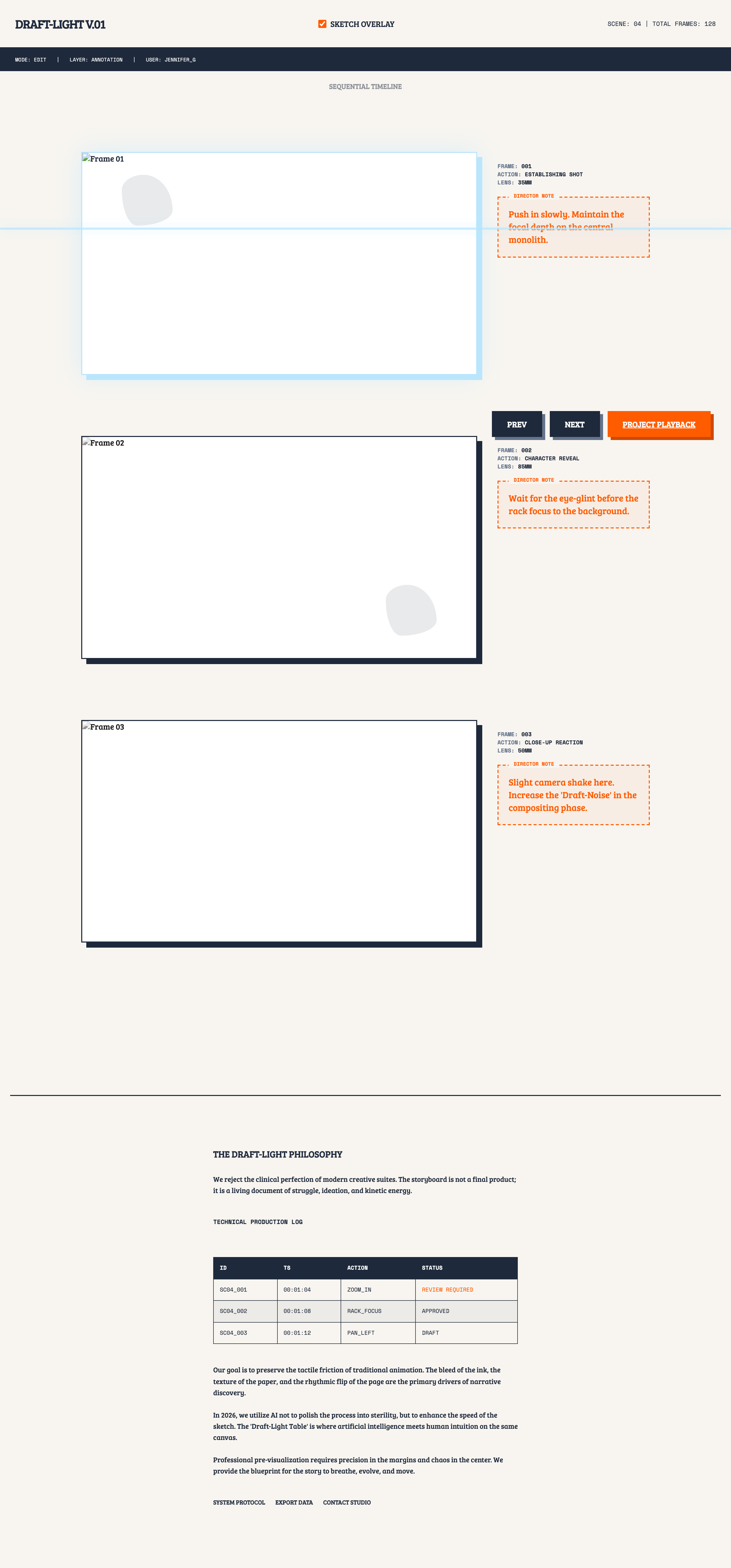 A professional, pre-visualization workspace that blends traditional ink-draft aesthetics with 2026 AI-assisted sketching and timeline-based scrollytelling.