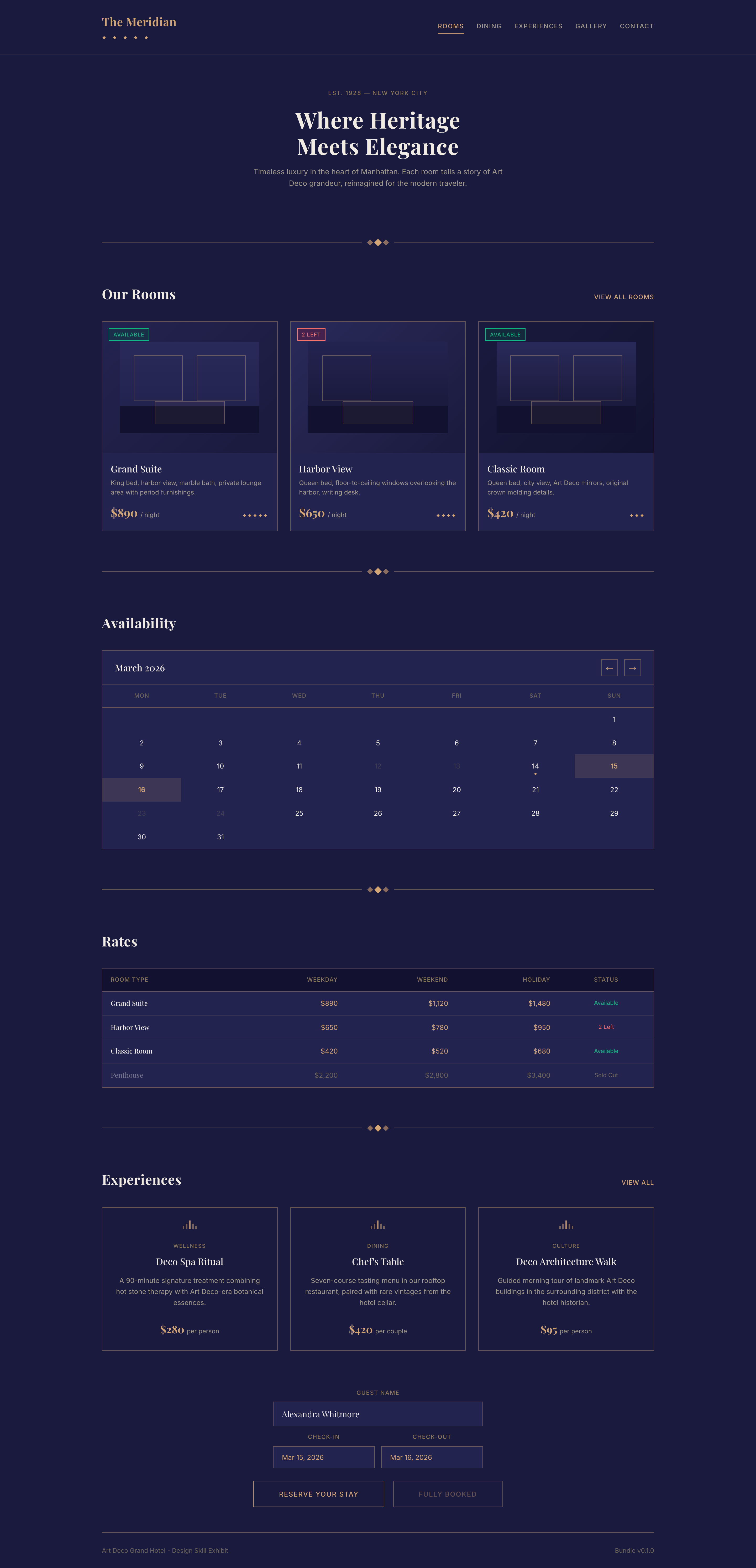 A 1920s Art Deco revival design system applying geometric gold ornaments, dramatic typographic contrast, symmetrical compositions, and jewel tone accents on deep navy to luxury hotel booking interfaces with room galleries, availability calendars, and guest experience packages.