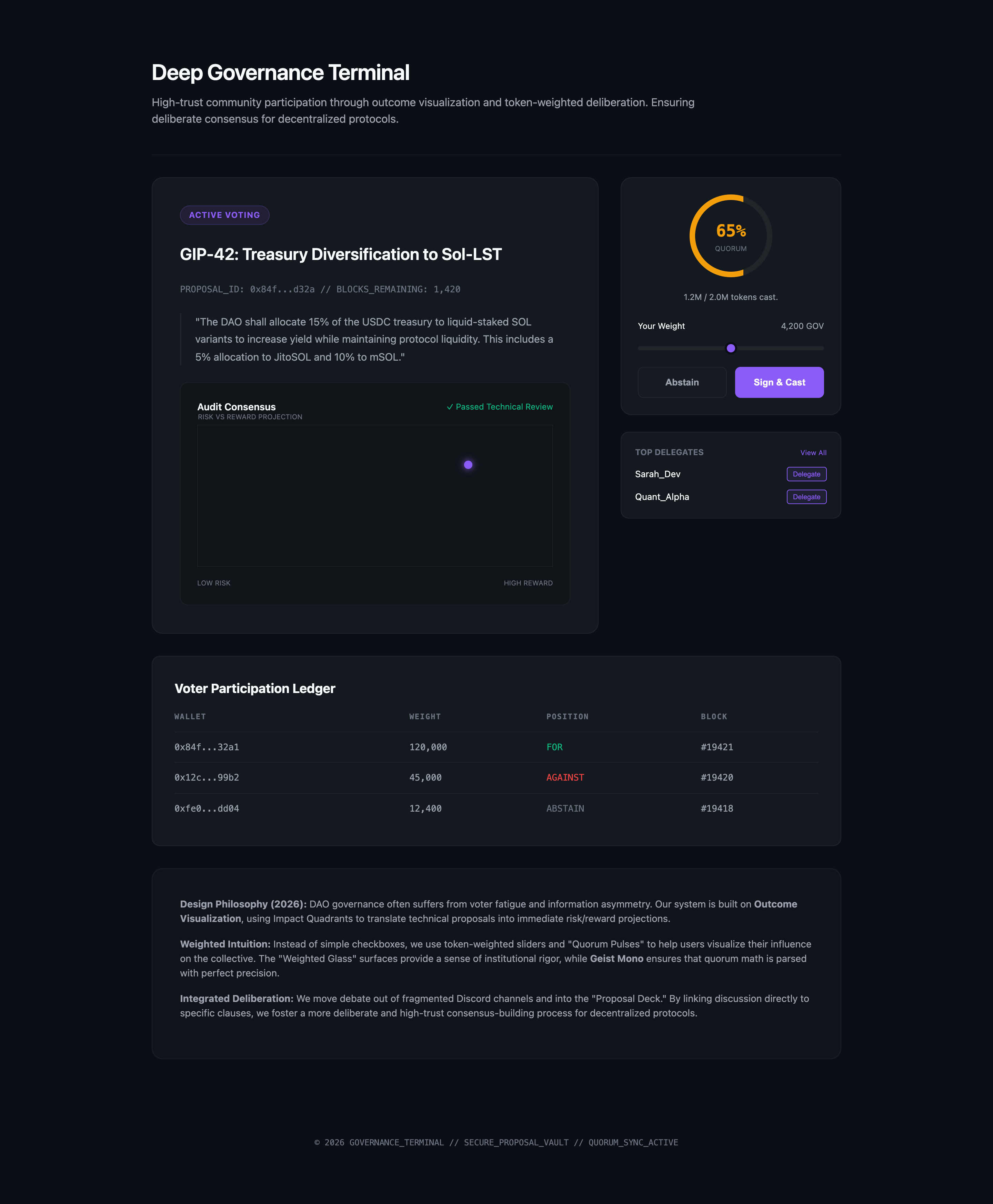 A high-trust participation platform for decentralized communities, featuring outcome-based quadrant charts, token-weighted sliders, and delegated "Power Mapping."