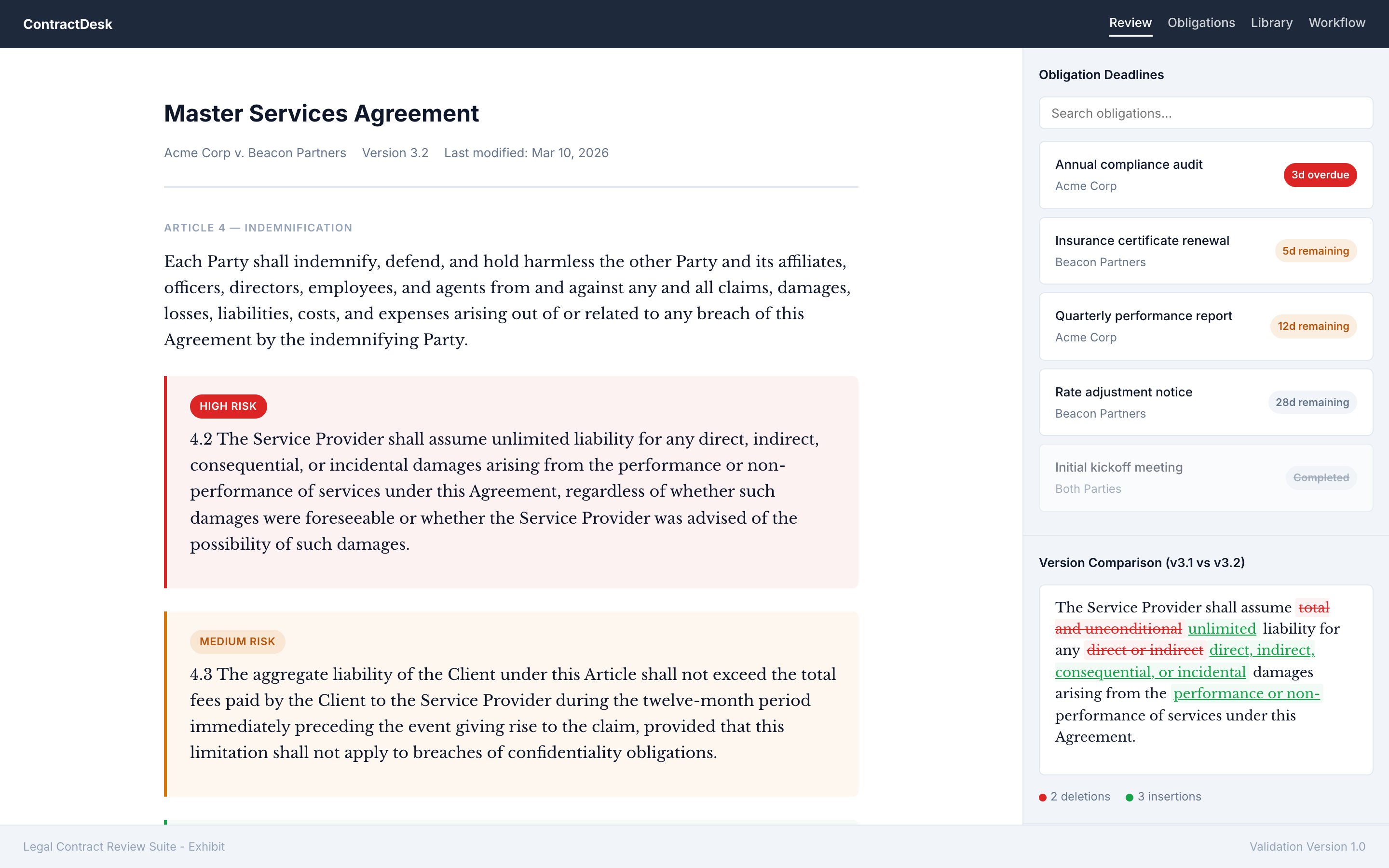 A formal, high-precision design system for contract review platforms combining Libre Baskerville serif body text with Inter UI chrome, conservative navy and gray surfaces, and redline annotation conventions (strikethrough red, insertion green) to support clause analysis, obligation tracking, and approval workflows.