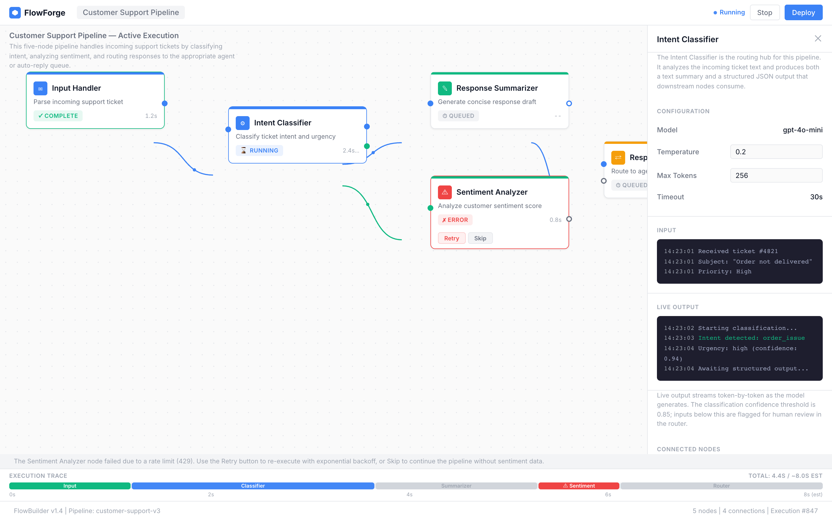 A clean, canvas-based workflow builder for multi-agent orchestration that uses color-coded connection lines by data type, node cards with execution status badges, and a horizontal timeline trace for building, running, and debugging agent pipelines.