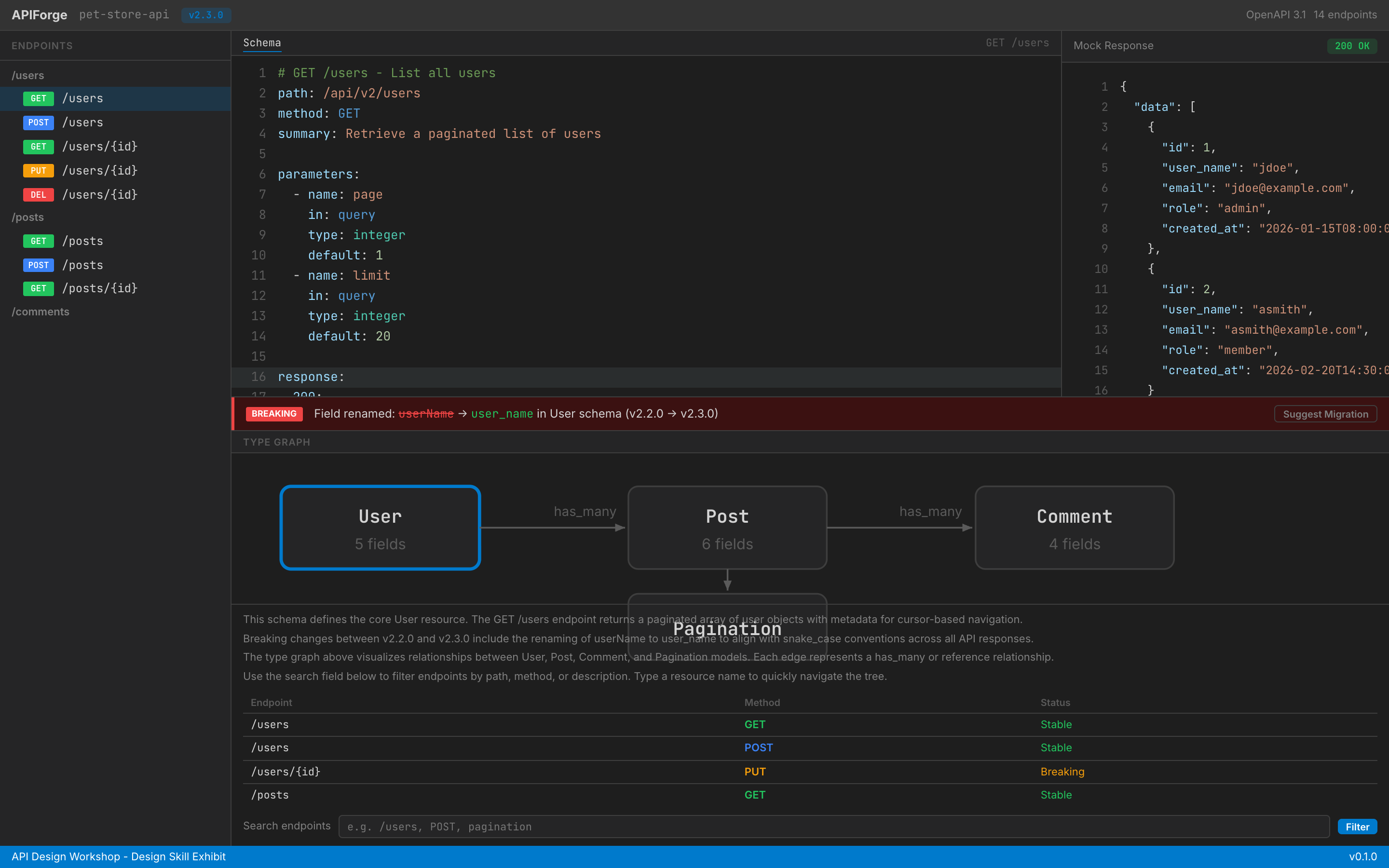 This Design Skill provides a complete visual and interaction system for API schema design and documentation tools. It defines VS Code dark theme-inspired syntax-highlighted editors, type relationship graph visualization, request/response split-pane previews, breaking change detection with migration suggestions, and endpoint tree navigation with HTTP method color coding. The system uses JetBrains Mono for code, Inter for UI, and a precise dark editor aesthetic.