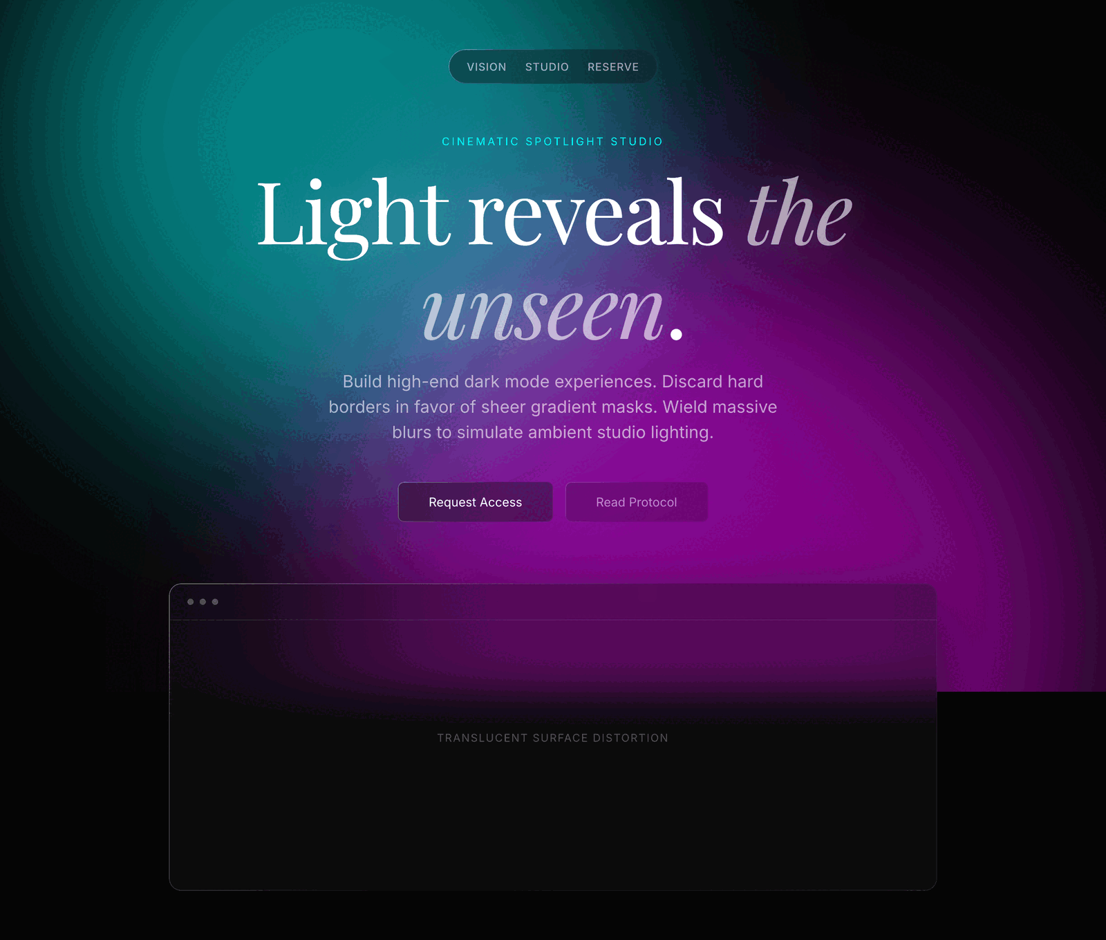 A dark, atmospheric digital studio where glowing, blurry spotlights interact with sheer, gradient-bordered glass UI elements and massive cinematic serif typography.