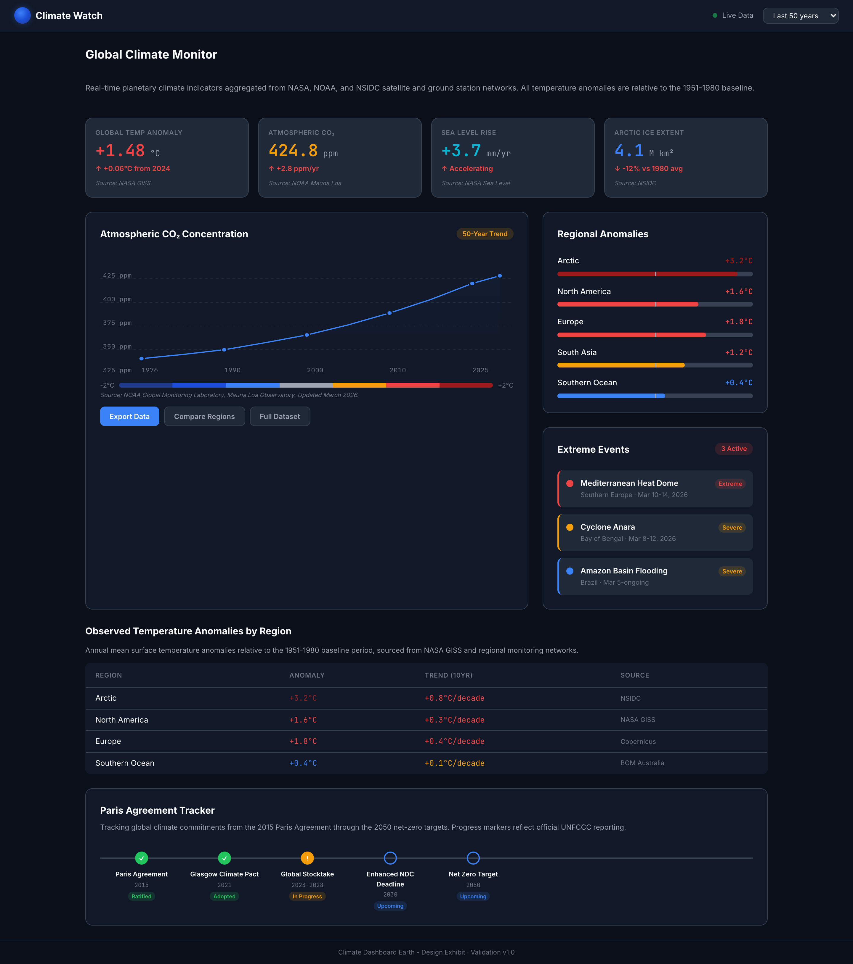 A planetary-scale climate monitoring design system with dark space backgrounds for globe visualization, temperature anomaly scales, CO2 trend charts, regional comparison bars, and policy tracker timelines using scientific precision and data