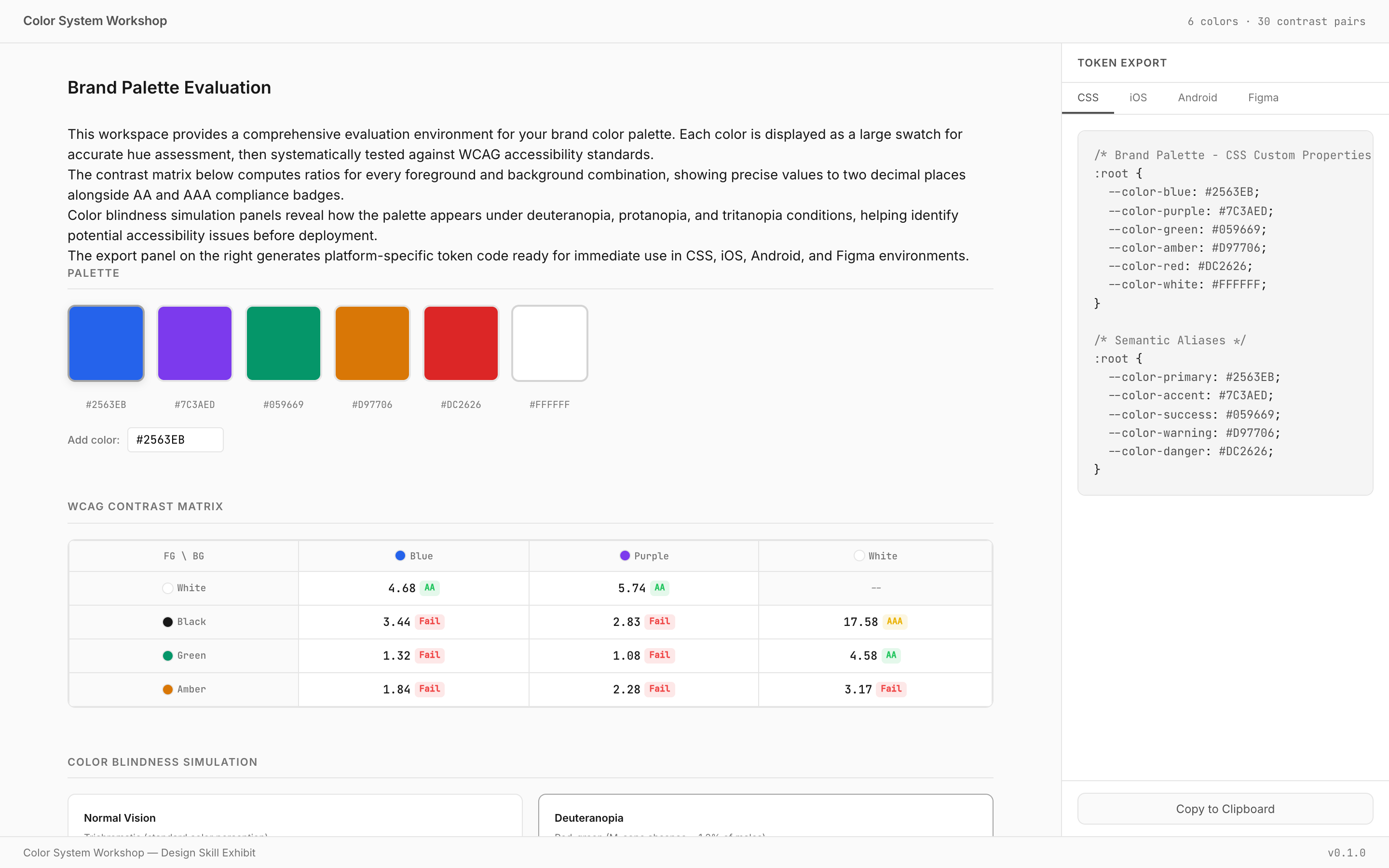 A color palette engineering and accessibility tool with neutral chrome, large swatch specimens, WCAG contrast matrices with AA/AAA pass/fail badges, color blindness simulation, and design token export panels.