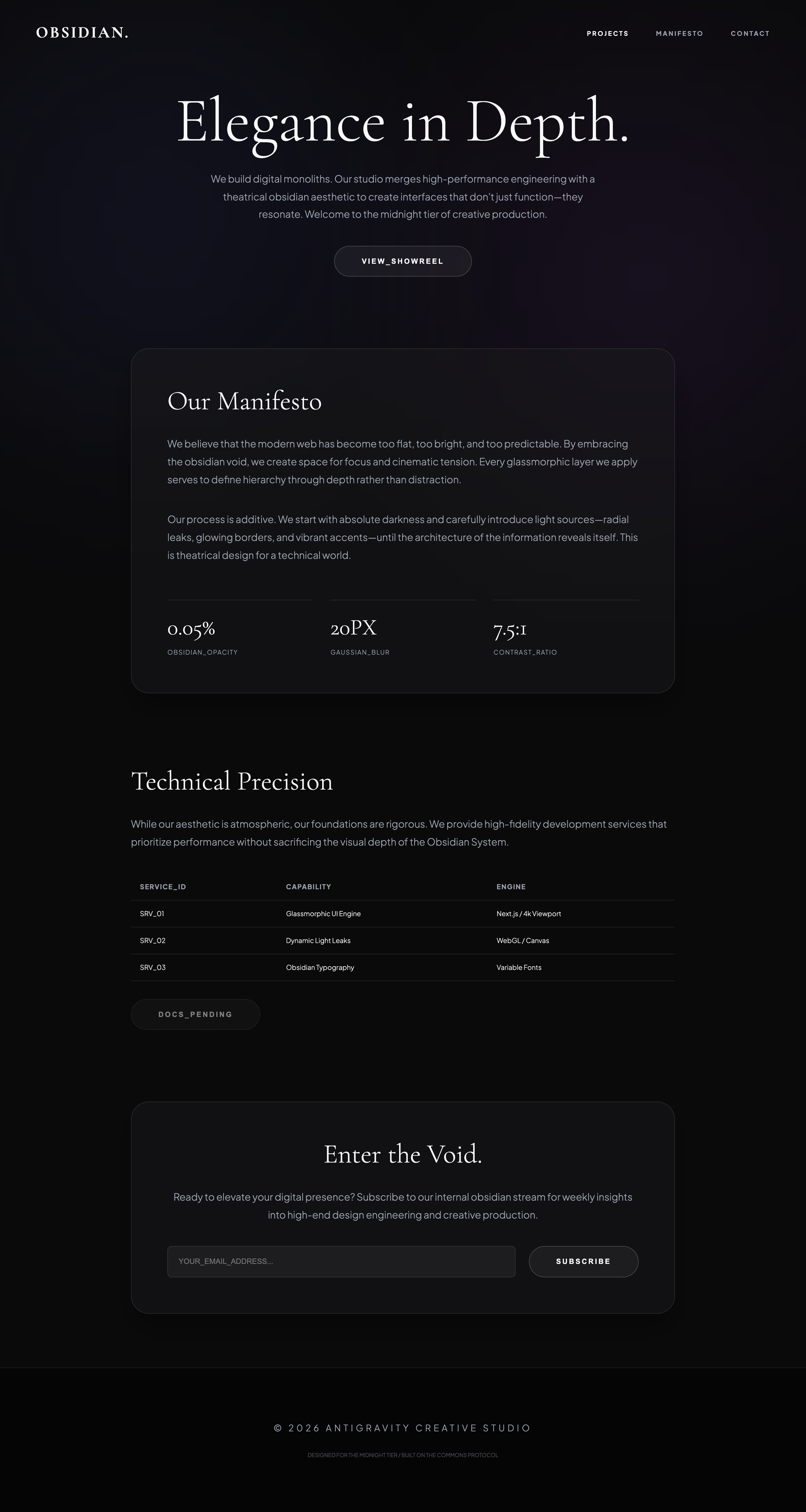 A luxurious dark-themed design system centered on obsidian depth, glassmorphic layering, and sophisticated typographic pairings for elite creative agencies.