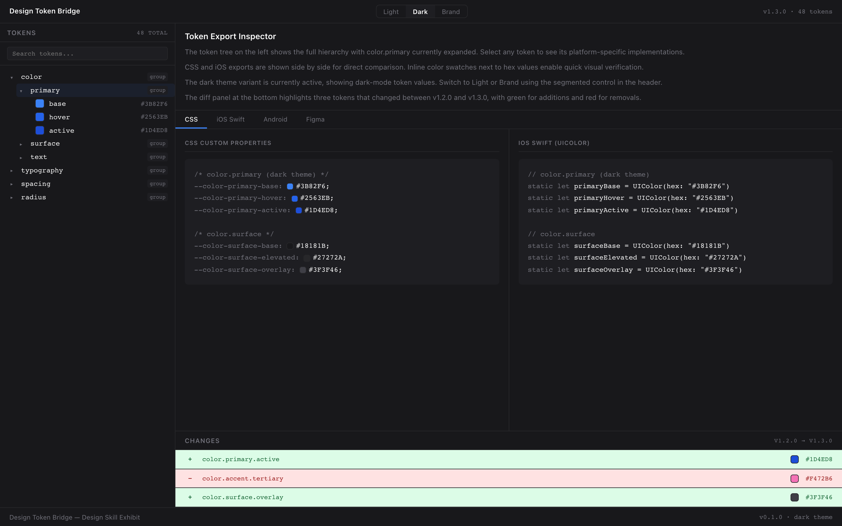 This Design Skill provides the visual system for building design token management and multi-platform export tools. The system bridges designers and developers with a token tree browser on the left, syntax-highlighted platform export previews (CSS/iOS/Android/Figma) on the right, theme variant switching (light/dark/brand), version diff viewers with red/green highlighting, and usage analytics. Neutral gray chrome ensures that the only saturated colors in the workspace are actual token color values rendered as inline swatches.