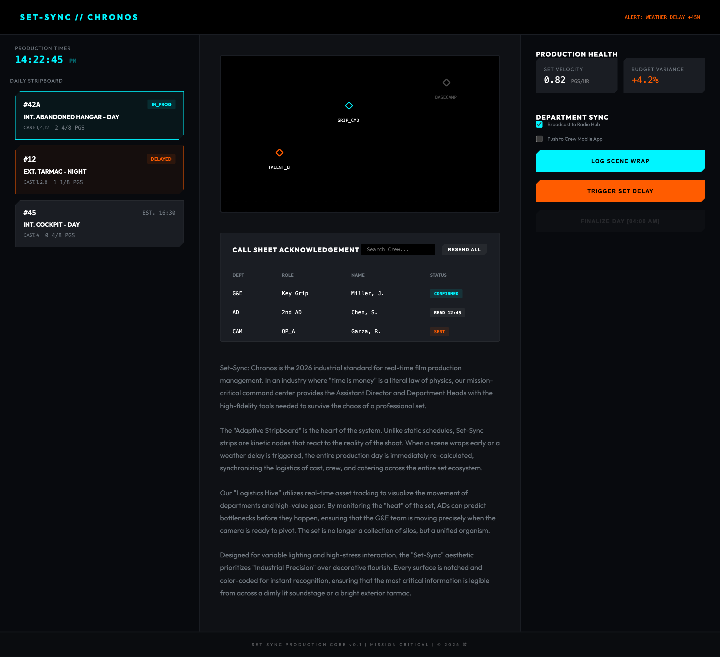 A rugged, high-precision industrial interface for real-time film set logistics, featuring adaptive stripboards and personalized digital call sheets.