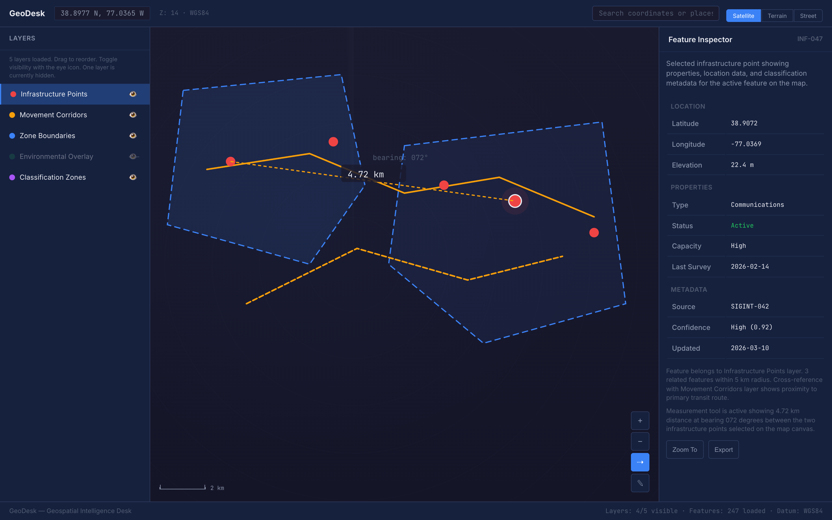 This Design Skill provides a comprehensive dark-themed geospatial analysis workspace language. It establishes cartographic precision with military-grade information hierarchy, layer stack management, coordinate readouts in monospace, measurement overlays, and feature inspector panels, all rendered on a dark navy map canvas that maximizes data overlay visibility.