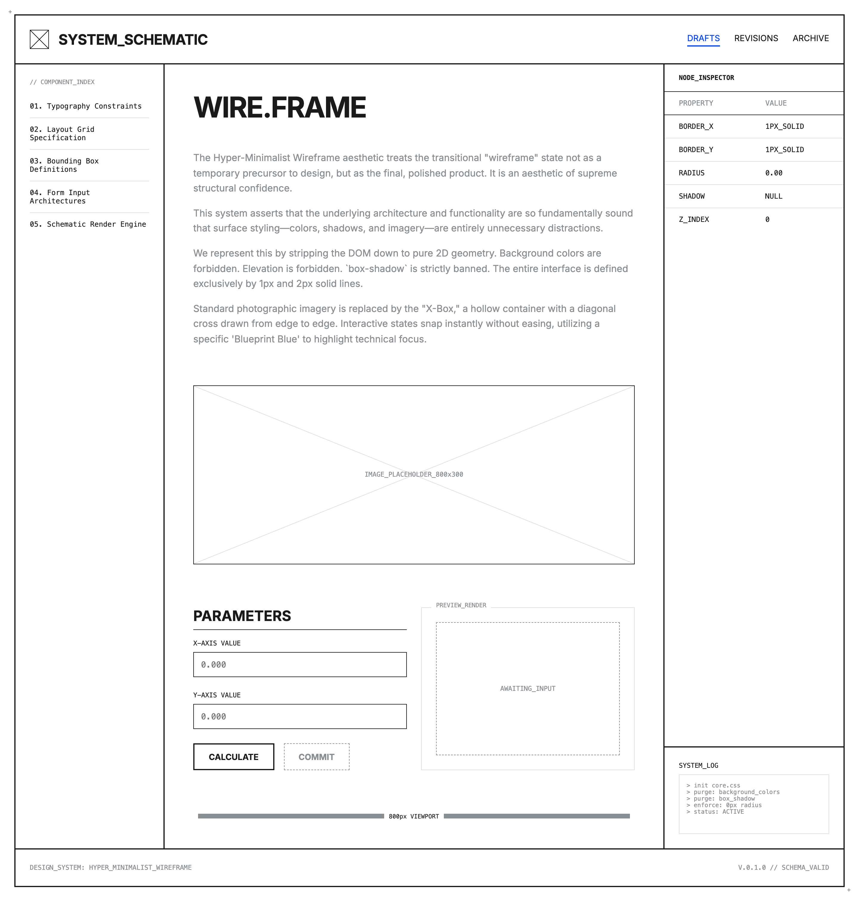 - Routes the "Hyper-Minimalist Wireframe" design language into the target product. - Abolishes all background colors on containers, replacing them with strict 1px or 2px borders. - Replaces standard media slots with architectural "X-boxes". - Enforces an unrounded, shadowless, flat 2D plane.
