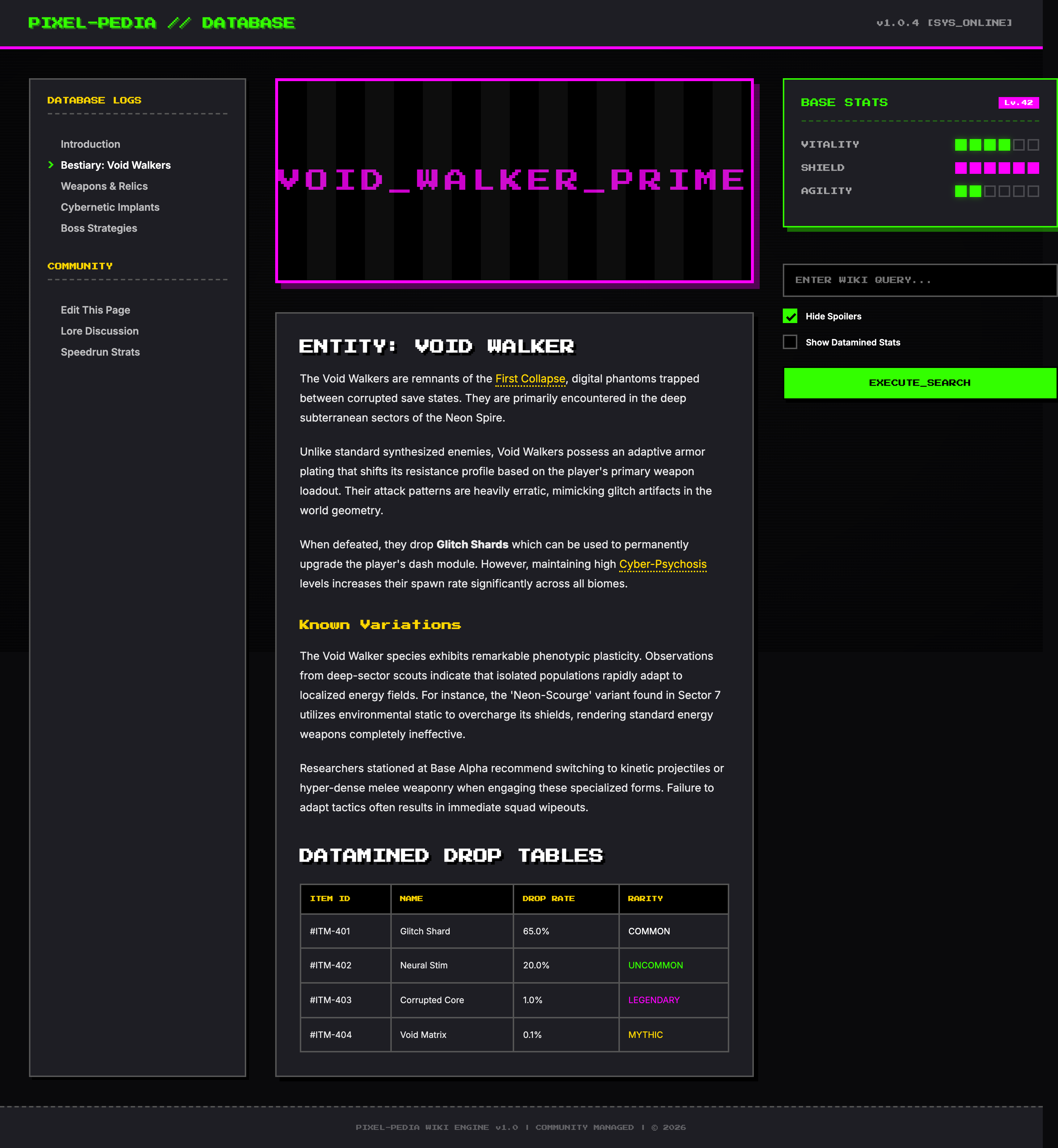 A retro-modern community knowledge base featuring 'Lo-fi Pixel Fusion' aesthetics, interactive stat blocks, and tactile gamified elements.