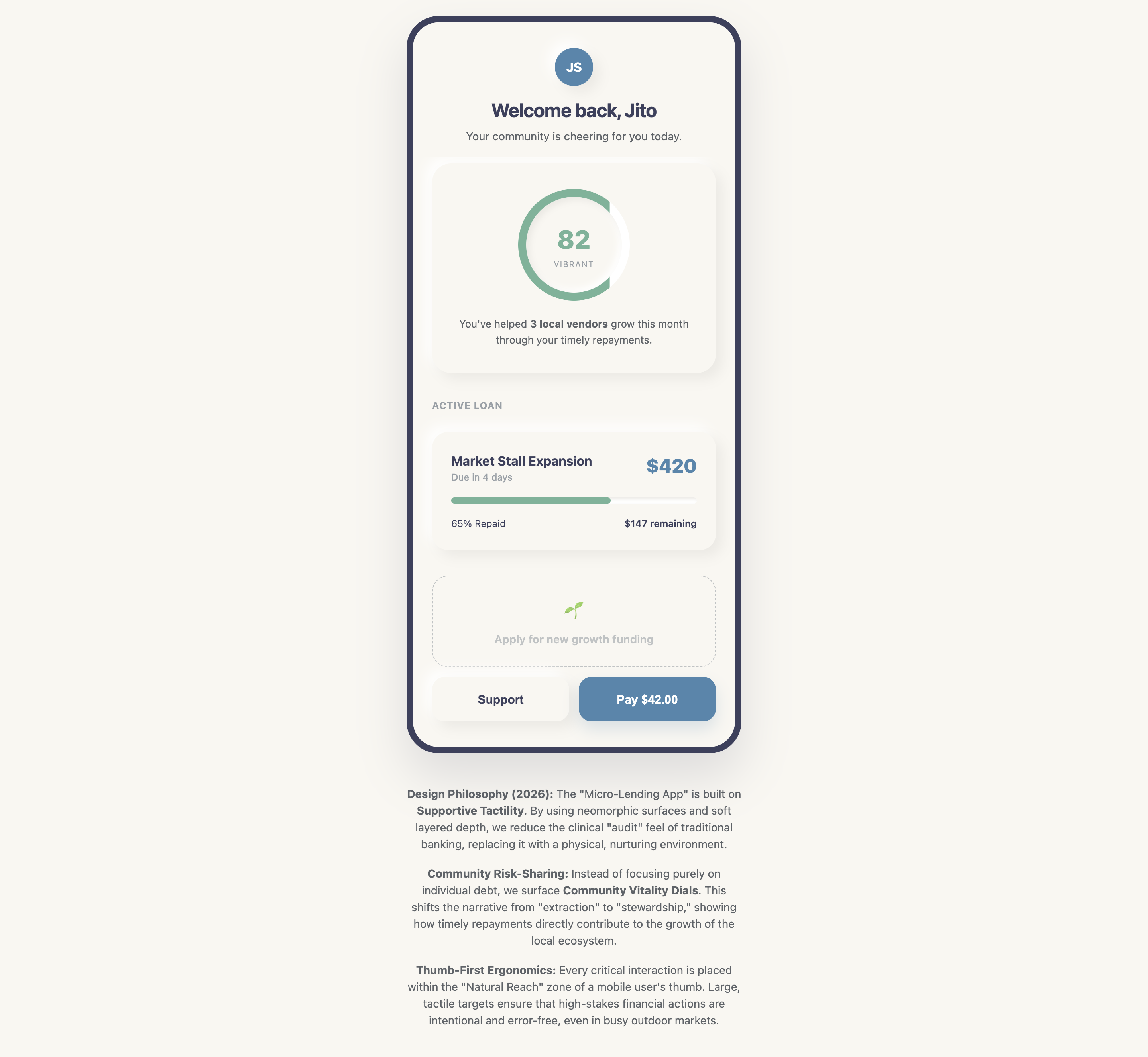 A supportive, mobile-first "Financial Inclusion" platform featuring tactile neomorphic surfaces, community-based risk dials, and empathetic underwriting journeys.