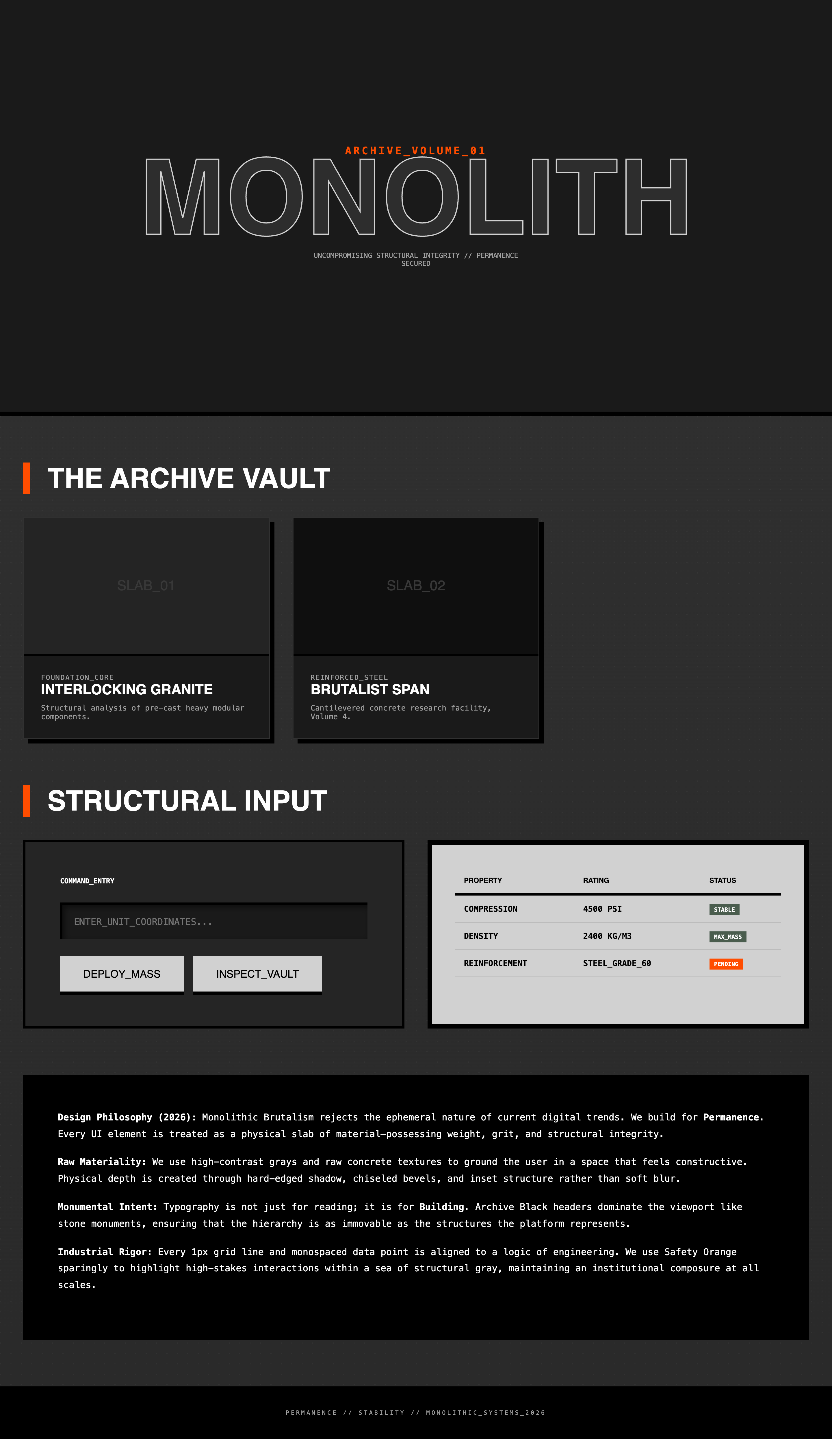 A heavy, structural system where interfaces feel carved from concrete slabs, brutalist plates, and monumental typography.
