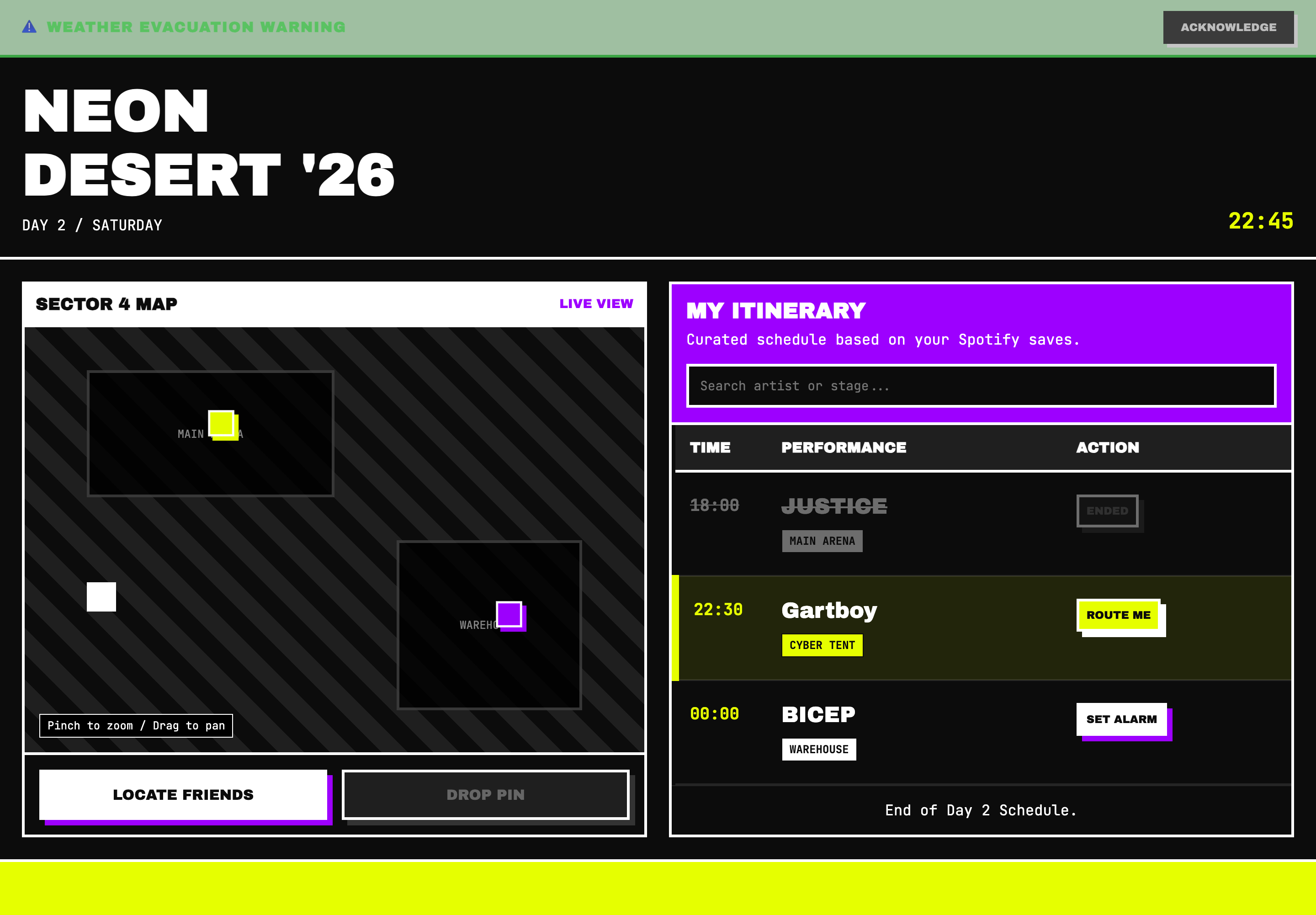 An aggressively functional, "Neo-Brutalist" interactive map and scheduling interface illuminated by intense spatial neon accents, designed for high-visibility navigation in chaotic live event environments.