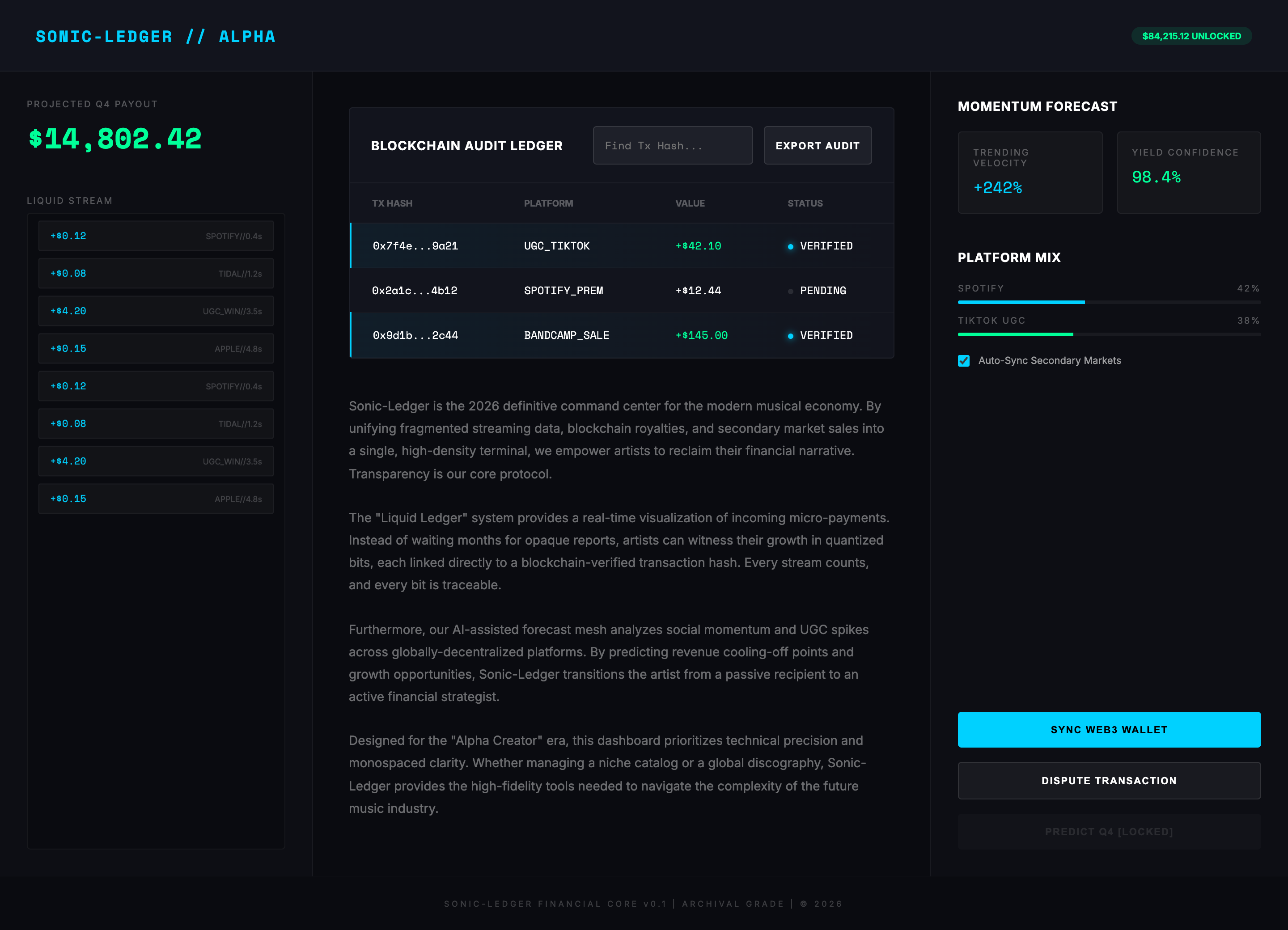 Retro-future artist financial dashboard with real-time royalty flow and blockchain verification.