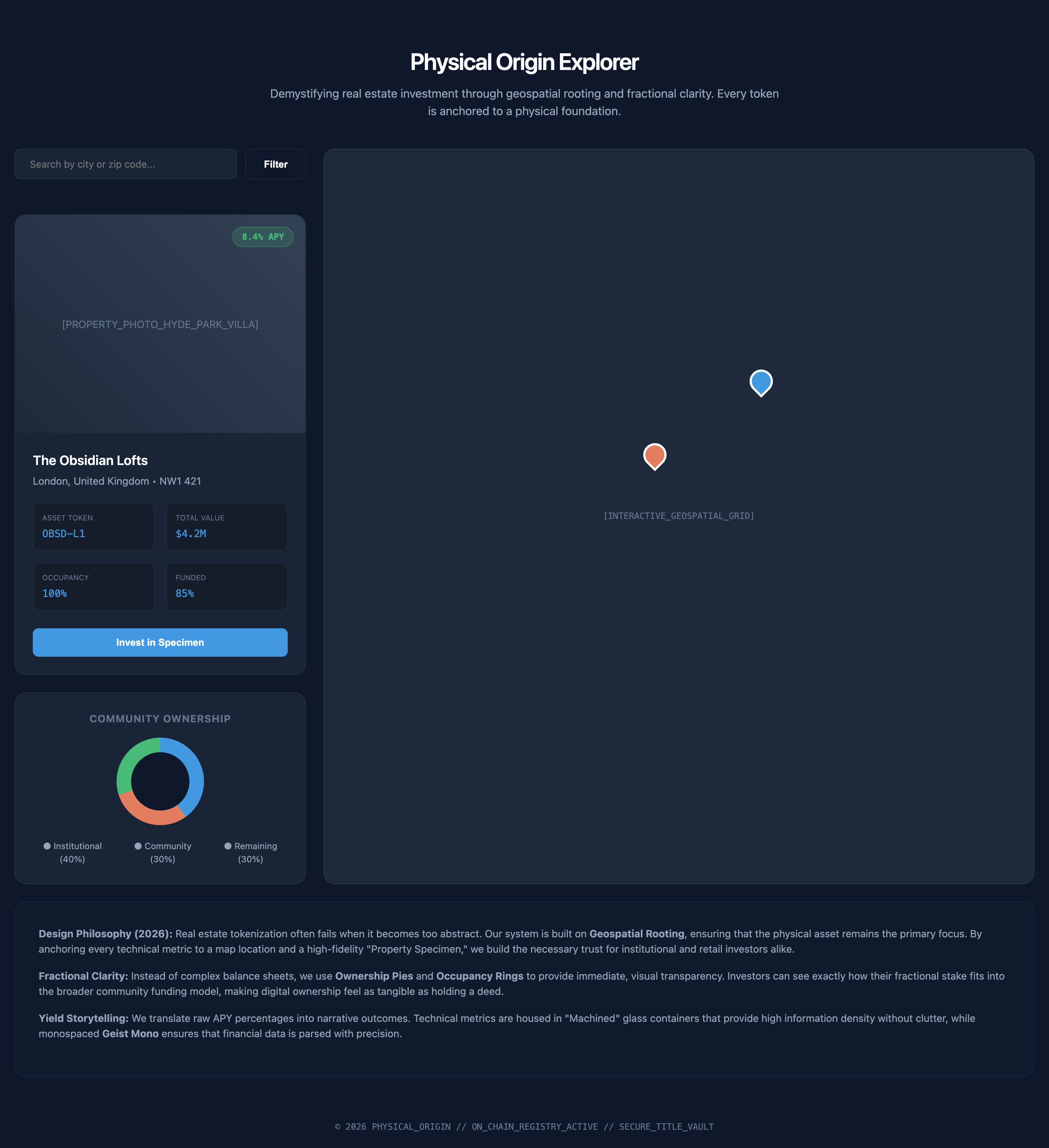 A high-trust investment platform that bridges physical property with digital liquidity through geospatial maps, fractional ownership pie charts, and "Yield Storytelling."