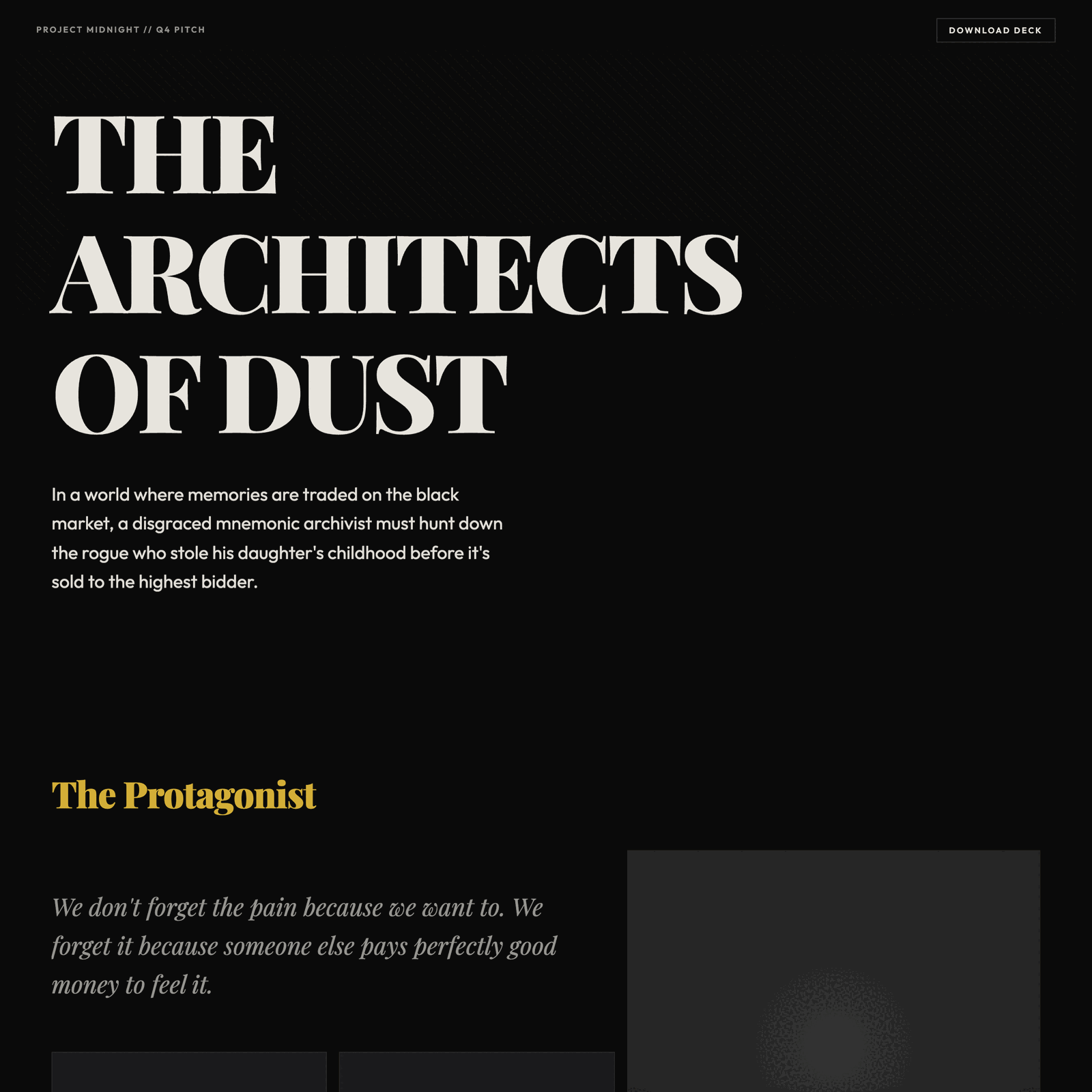 A highly visual, narrative-driven presentation interface utilizing a 'Bento Box' grid system, expressive mutant-serif typography, and edge-to-edge cinematic imagery to sell a story's atmosphere.