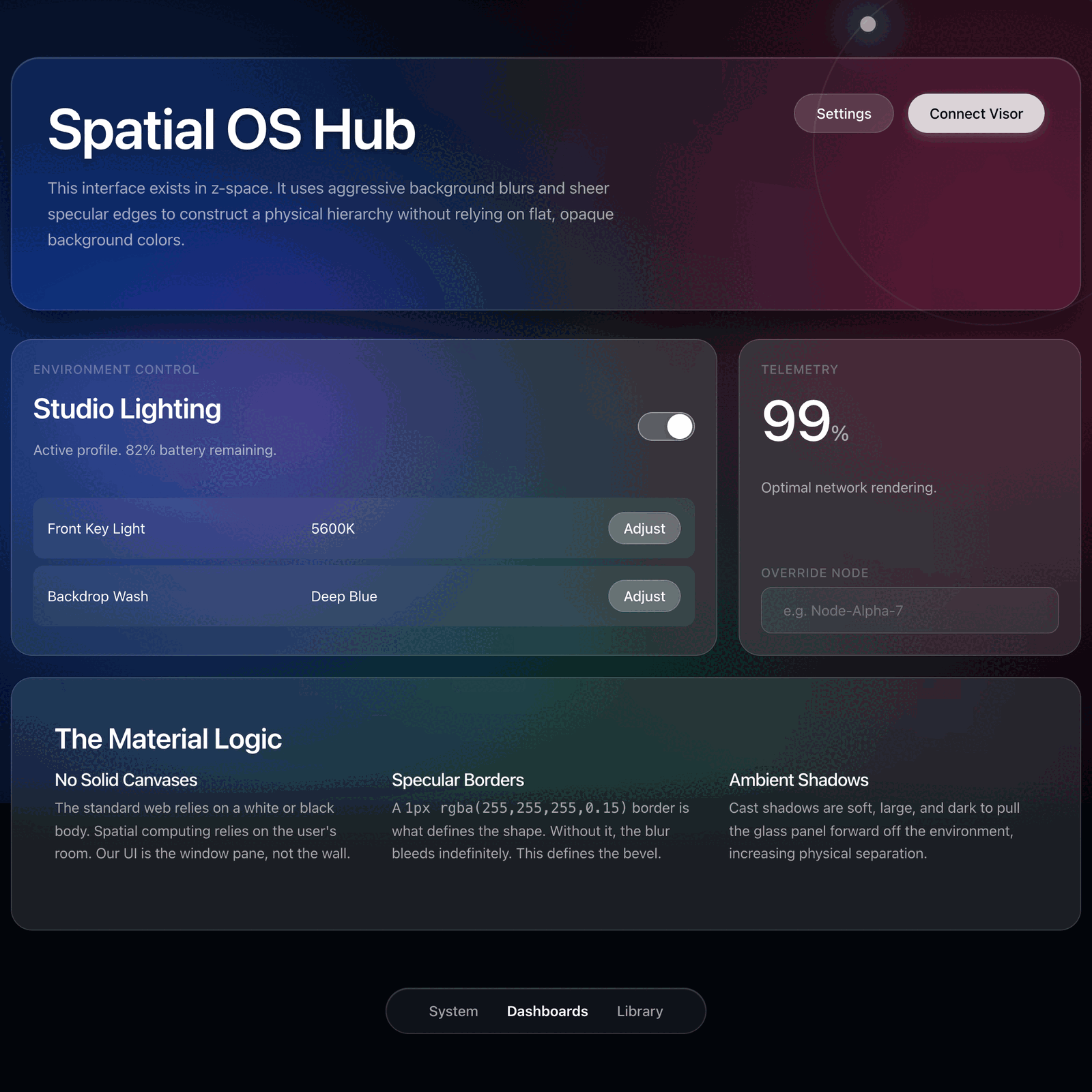 This tool generates advanced "glassmorphism" interfaces imitating next-generation spatial computing OS environments (like Apple visionOS). It relies on constructing UI out of translucent, heavily blurred layers stacked over deep, ambient backgrounds. Solid container background colors are forbidden.