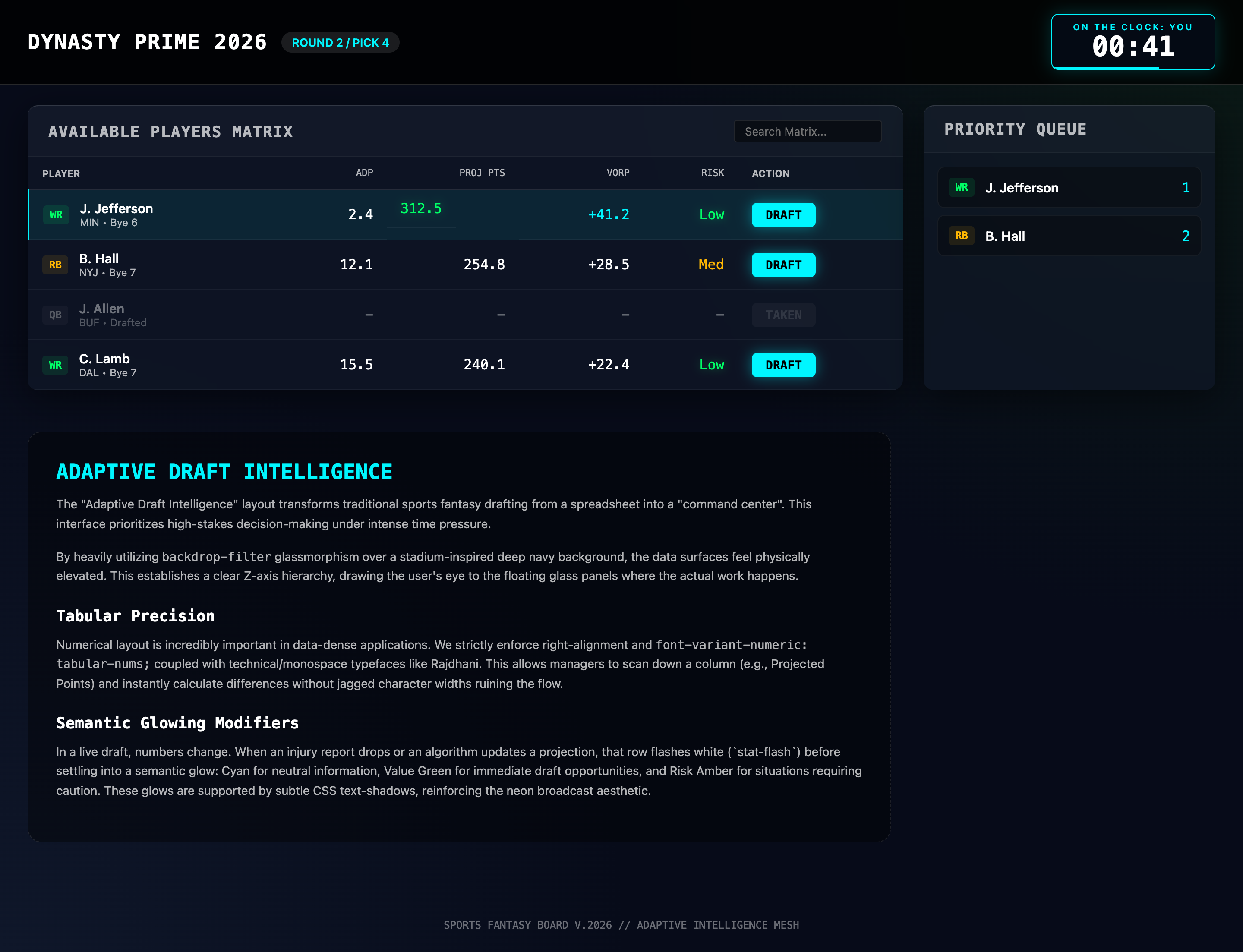 A high-stakes, data-dense drafting interface that utilizes "Glass UI", tactile player cards, and glowing real-time analytics to empower split-second fantasy sports decisions.
