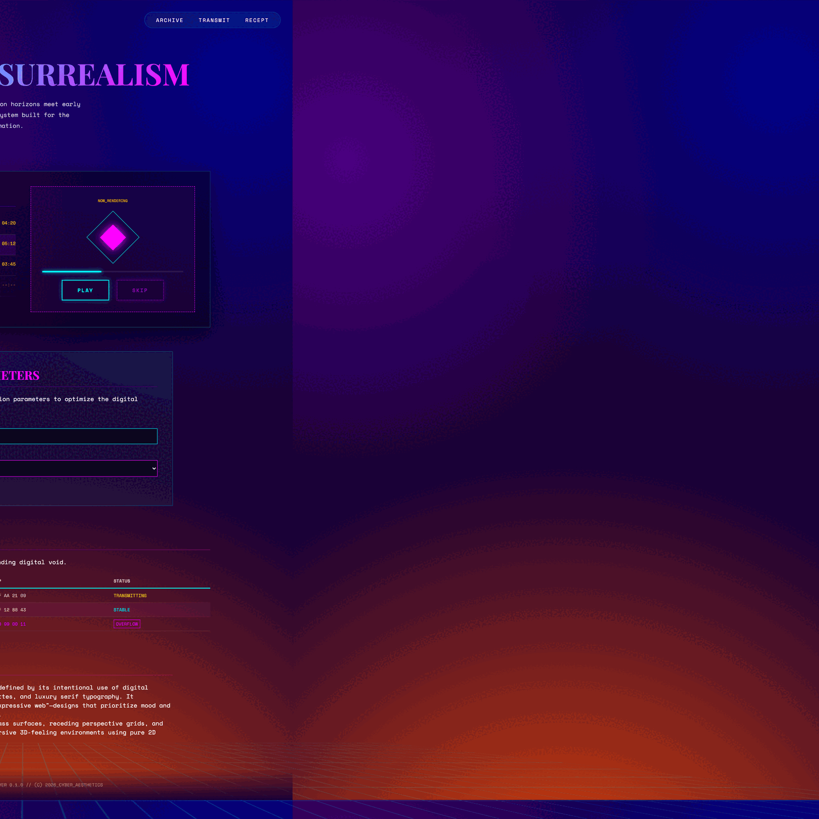 - Transforms the product into a "Vaporwave Subnet"—a surrealist digital environment. - Implements deep "Dusk Purple" backgrounds with neon Cyan and Magenta highlights. - Sets headlines in high-contrast Serif typography and interface labels in Monospace. - Layers translucent glass containers over perspective grid patterns.