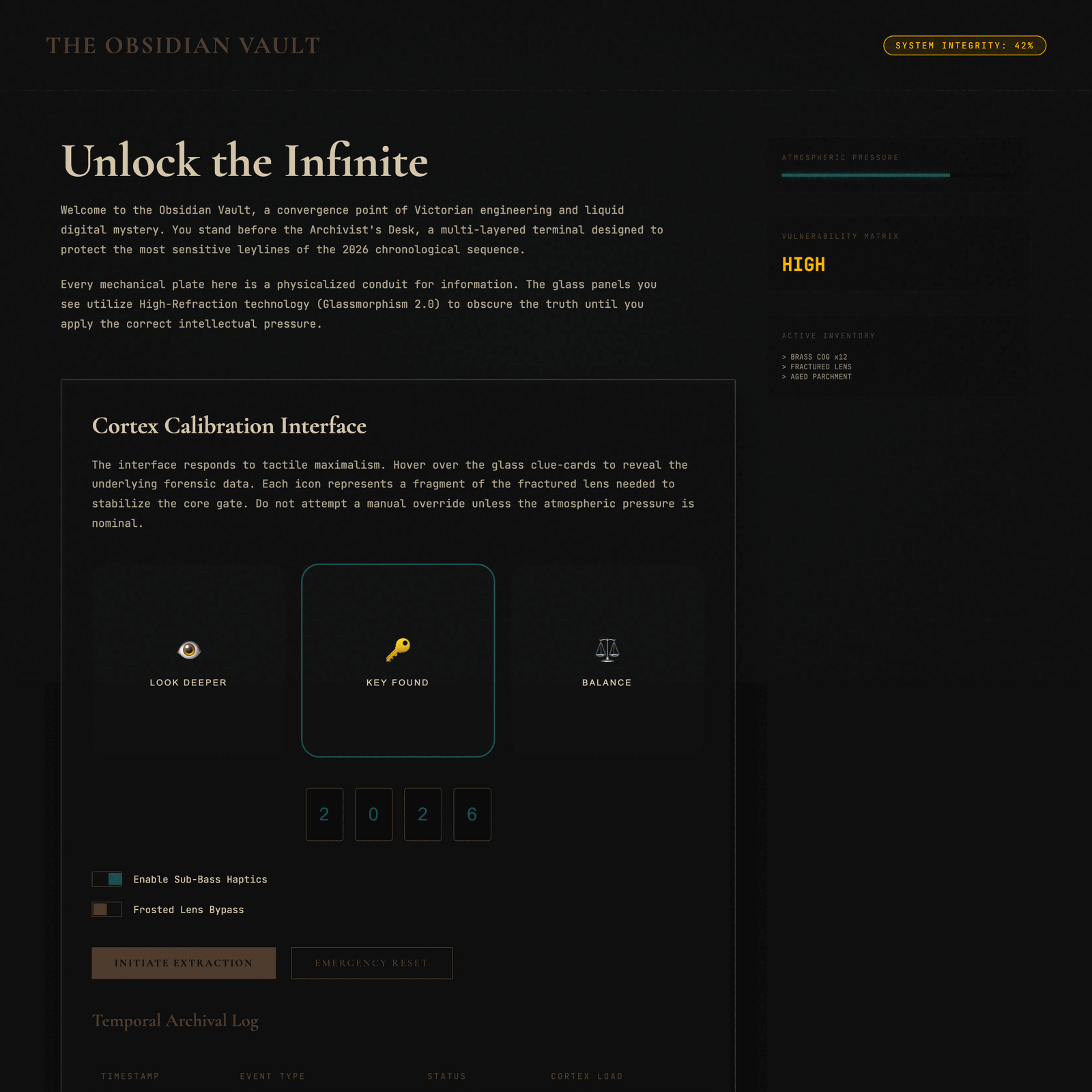 A high-immersion, 'Hyper-Tactile Mystery' interface for virtual escape rooms, featuring Neo-Skeuomorphic textures, glassmorphic depth, and haptic feedback simulations.