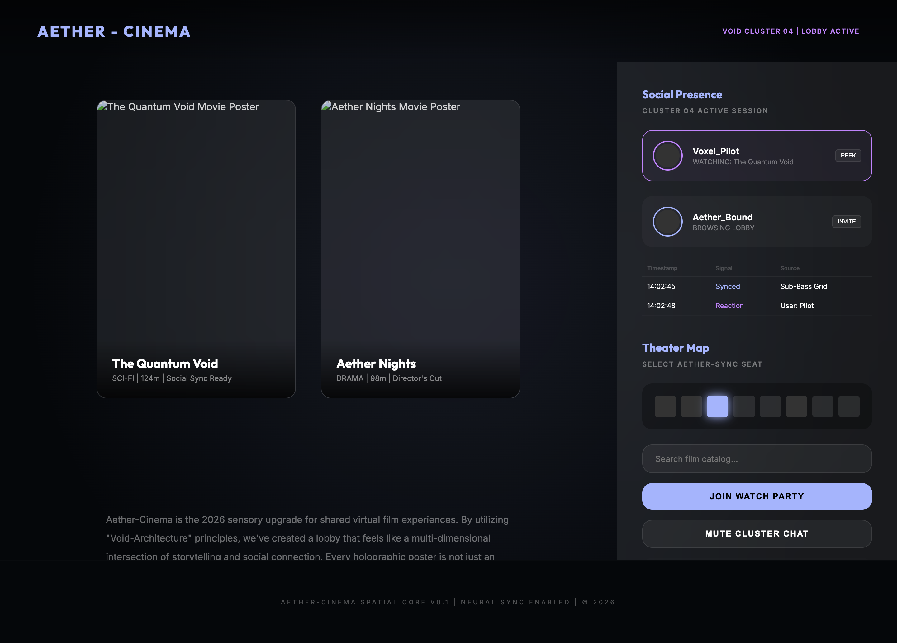 Social cinematic portal with floating glassmorphic panels and real-time presence indicators.